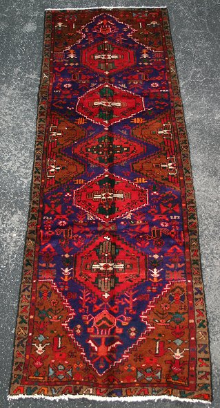 HAND KNOTTED HAMEDAN RUNNER: Approx. 3' x 9'6'', deep purples, reds and earth tones, hand knotted in Iran.