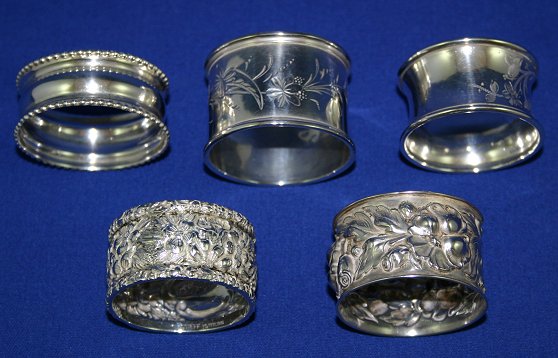 FIVE STERLING NAPKIN RINGS: ''Repousse'' by Stieff, a Gorham inscribed to Sister, a Webster with beaded edging, and two unidentified . Sold as a lot.