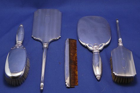 GORHAM AND WEBSTER STERLING DRESSER SETS: A hand mirror and brush by Gorham (the mirror is loose, has a dent). A Wallace Hand mirror, brush and comb holder. No monograms.