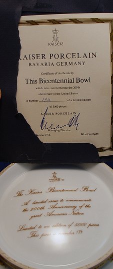 KAISER BICENTENNIAL COMMEMORATIVE PORCELAIN BOWL: Showing historical images and portraits. Limited edition, this one is number 134 of 5000. With the certificate. 10 1/4'' dia., 4 3/4h. No chips or cracks.