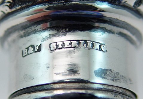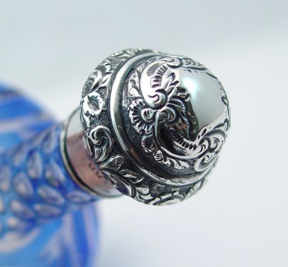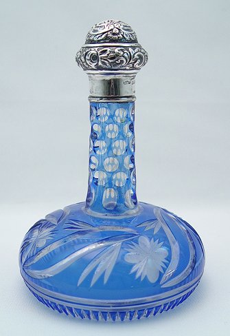 STERLING MOUNTED COBALT CUT TO CLEAR GLASS PERFUME BOTTLE: Embossed sterling acorn shaped top. Intaglio cut flowers and leaves with rayed bottom (one ray is nicked off). 5 1/4''h, 3 1/2'' dia. at the base. The sterling is hallmarked B&F.
