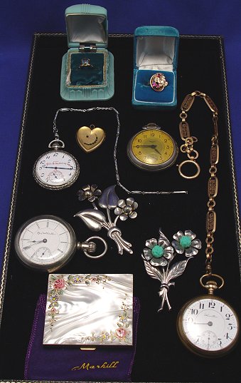 TRAY LOT OF ESTATE JEWELRY & POCKET WATCHES: Two rings to include, 14k yellow gold and ruby ring in a floral spray motif, size 6; 10k yellow gold and aqua ring, size 5. Four pocket watches to include, Hamilton 18 Size full plate open face grade 940 21 jewel serial #985709, in a gold filled case by Monitor serial #3628365. I'd say currently keeping time but missing one hand so even though running not really telling you the time. With an approx. 12''l. gold watch chain with lovely open wire work links, unmarked but assays at 14k. Elgin size 18 open face lever set 17 jewel serial #6104339, in coin silver case, serial #504817599, currently keeping time. Elgin open face personalized ''John O. McKillop A Century of Progress 1933''. I'd tell you more about the works but I can't get the back off. And a Westclox Dax pocket watch. Sold with two tin? floral pins, heart shaped locket and a Marhill compact with painted enamel design to faux mother of pearl top. Sold as a lot.