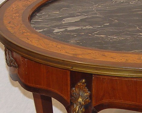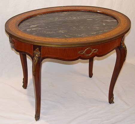 LOUIS XV STYLE FRENCH MARQUETRY INLAY AND MARBLE TOP SIDE TABLE: Earlier 20th C oval table with black marble top framed by a marquetry band. Ormolu mounted legs. 21 1/2''h., x 30'' x 23''.