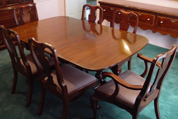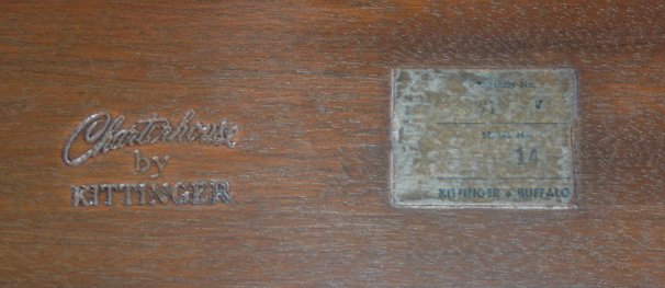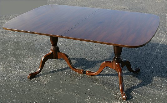 KITTINGER CHARTERHOUSE MAHOGANY DINING TABLE: Double pedestal tripod bases. Two leaves, each 18''w. Branded on the underside ''Charterhouse Kittinger''. 44'' x 68'' with leaves out. Top is in excellent condition, feet show minor wear, the pads have been in use and are included.