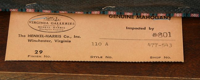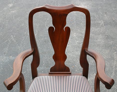 SET OF 6 HENKEL HARRIS QUEEN ANNE STYLE CHAIRS: In mahogany. Also known as the Mt. Vernon chair. Finish # 29, Style 110S. Shaped splats and top rail, Queen Anne legs. Two are arm chairs, four are side chairs. Excellent condition. 39''h., the seat is 22''w., 18''deep.