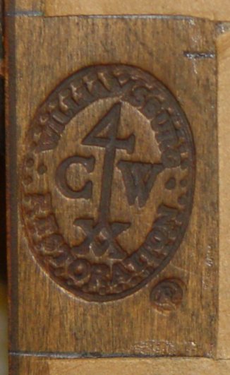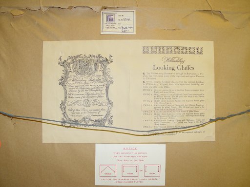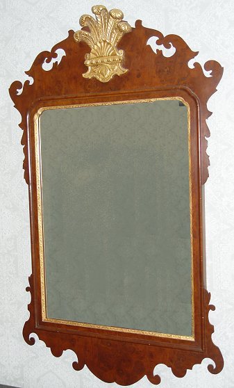 WILLIAMSBURG RESTORATION BURLED WALNUT MIRROR: Surmounted by gilt plumes. Beveled glass. The original now hangs in the West Hall of the Raleigh Tavern in Williamsburg. 46'' x 29'' overall.