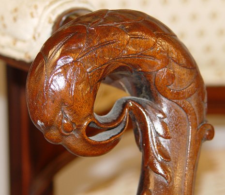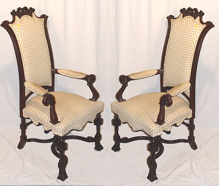 PAIR OF FIGURAL CARVED MAHOGANY OPEN ARM CHAIRS: Carved eagle heads at the hand holds, crest and at top of each stile. William and Mary type legs and curved stretchers. 47''h. x 27'' x 23''.