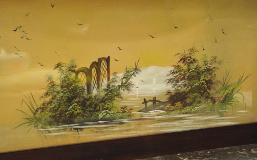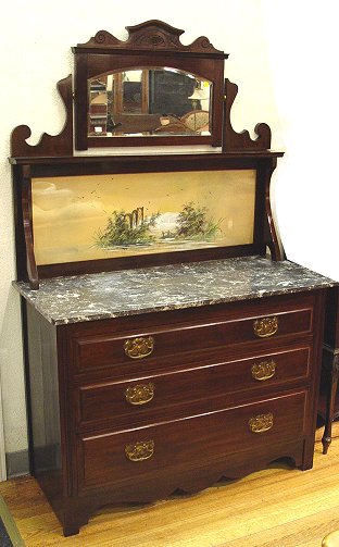 ART NOUVEAU WALNUT WASH STAND: Scenic hand painted backsplash with swing mirror. 3 full length drawers under a gray marble top. Approx. 65'' x 42'' x 16''. Est. $350/500**