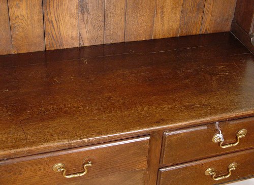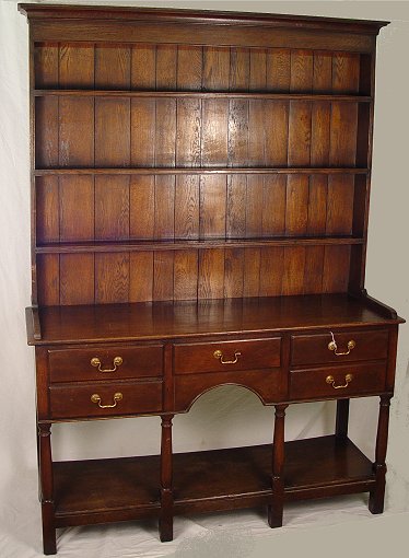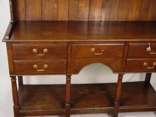 LATE VICTORIAN ENGLISH OAK DRESSER / OPEN HUTCH: Two part cupboard with upper section being open shelving with plate grooves, the back is paneled, straight molded cornice. Lower section has five drawers, shaped skirt, open stretcher shelf across the bottom. 75 1/4''h. overall. The base is 32''h., 54''w., 16 1/2'' deep.