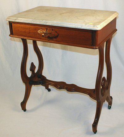 VICTORIAN WALNUT MARBLE TOP STAND: One full length drawer with carved pull, shaped stretcher, white marble. Approx. 30'' x 25'' x16''.