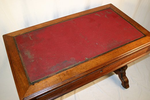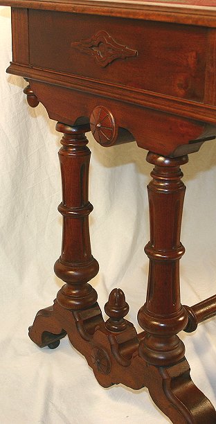 VICTORIAN WALNUT LIBRARY TABLE: A single full length drawer, turned stretcher between double column legs. The felt surface is showing its age. We have been told the match to this table sits in the California capital. Please note loss of one drop finial. 29 1/2''h. x 35 1/2'' x 20''.