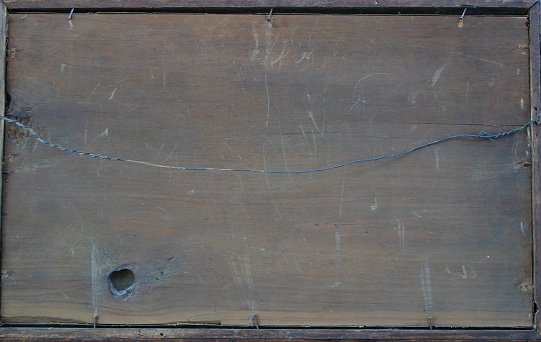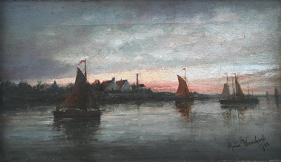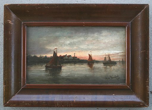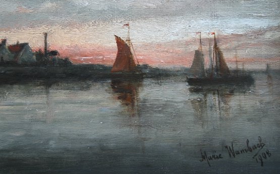 WAMBACH de DUVE, Marie, (Belgian, 1865- ?): Sunset harbor scene, O/C, tacked to board, 8 1/2'' x 14 1/2'', signed lower right, dated 1908, encased in brown molding of the period, worn, scratched, measures 14'' x 20''. Condition - Needs cleaning.