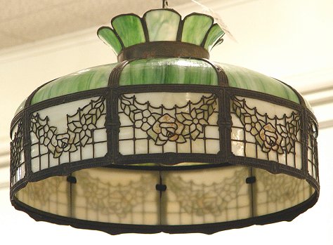 VINTAGE GREEN SLAG GLASS HANGING LIGHT: Nine bent panels of green slag glass, white glass panels under floral filigree metal. 21 '' dia.