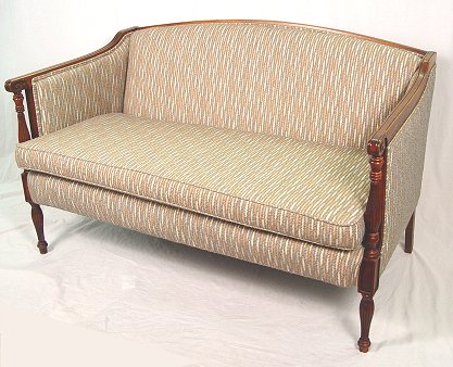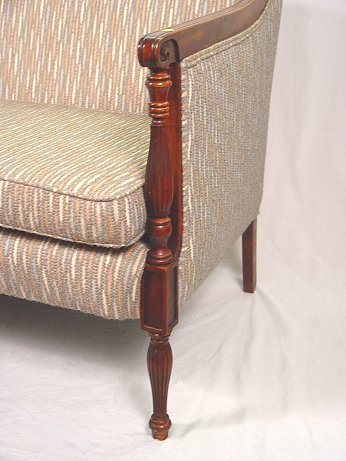 SHERATON STYLE LOVE SEAT: Mahogany frame with round reeded legs. Striped, highly textured upholstery. 54''l.