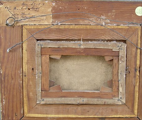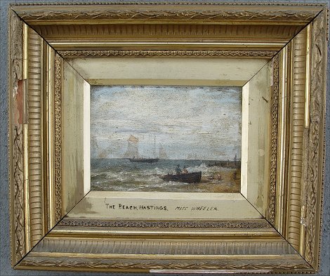 19TH C ENGLISH O/C ''THE BEACH, HASTINGS'': 5'' x 7'', encased in period, well worn, partially damaged, gilded frame, overall 11 1/2'' x 13 1/2'', inscribed on front ''The Beach, Hastings Miss Wheeler'', also label verso with ''The Beach, Hastings'' and the address of Miss Wheeler.