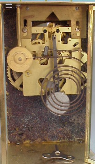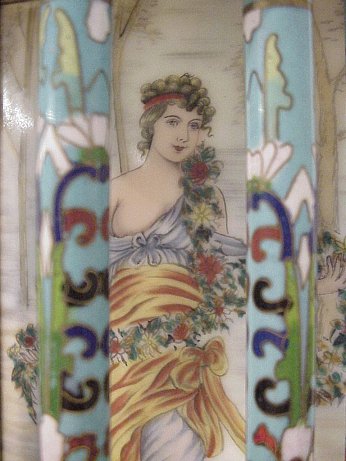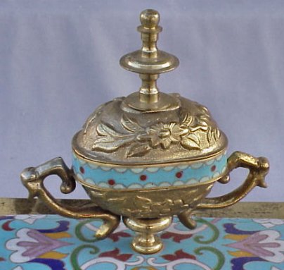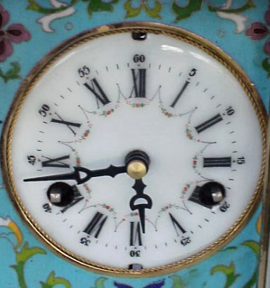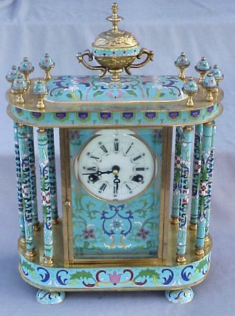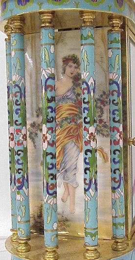 CLOISONNE AND BRASS MANTLE CLOCK: Case is blue ground cloisonne, side panels are hand painted semi nude figures. Surmounted by urn finial. Enameled dial, key wind, chimes. Pendulum and key included. 18''h, 12 1/2'' w. overall.