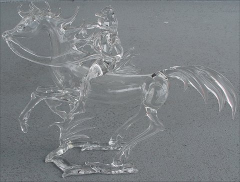 FANTASTIC ITALIAN? BLOWN GLASS MOUNTED HUNTSMAN: Astride his horse blowing his horn, presumably blown from single piece, slight stress fracture to right front leg, approx. 8''h. x 15''l.