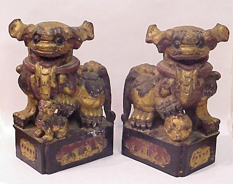 CITROEN WOOD FOO DOGS: Carved from solid blocks of highly fragrant citroen wood. Red and gold paint decorated, starbursts carved into the tops of their heads, and fish motif carved into the bases. One has a baby underfoot, the other a ball, note age separation to one base. 13 1/2''h. Actual age unknown. Est. $200/300**
