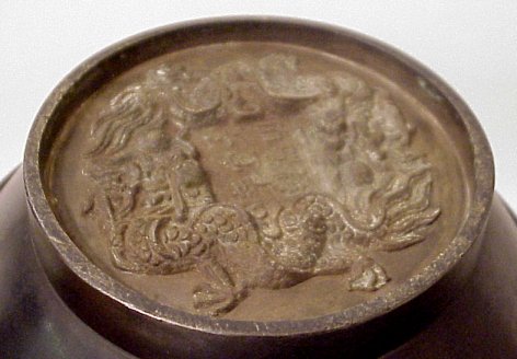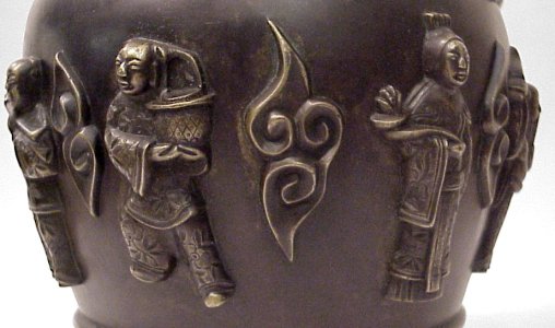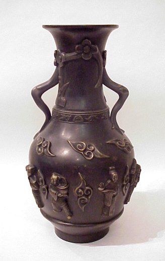 MING DYNASTY BRONZE VASE: Floral and foliate trim and handles, body decorated with immortals dancing amongst clouds, base with dragons chasing balls around the six character mark, purported Great Ming Dynasty, made in Hsuan-Te, 1426-1435, 15 1/2''.