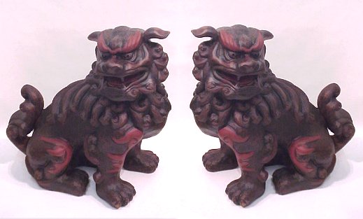 TERRA COTTA FOO LIONS: Finished in a dark red wash with red paint accents and flowing hair. Impressed chop marks on the bottom, 17''h, actual age unknown. Est. $300/400**
