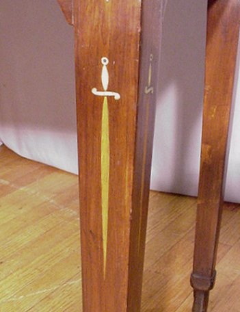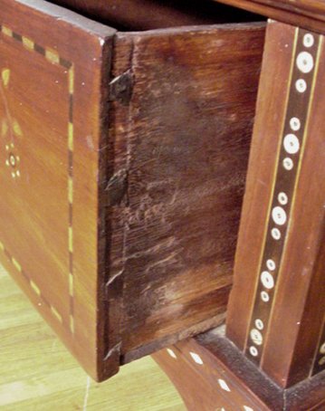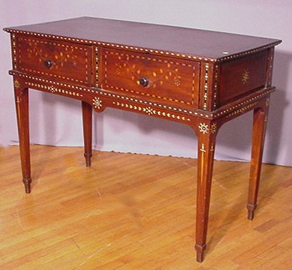 19TH C ANGLO-INDIAN INLAID SERVER: Featuring sword design inlay to the tapered legs, 2 drawer. 36''h. x 23 1/4'' x 48 1/2''.