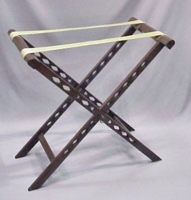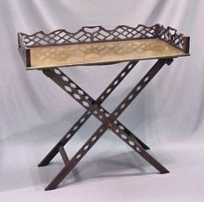 MAHOGANY SERVING TRAY ON STAND: Pierced carved gallery on tray, 33 x 17. Matching folding stand.
