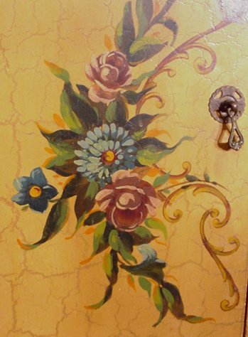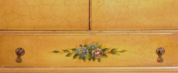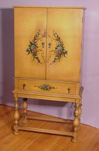 PAINT DECORATED SECRETARY: Double door upper cabinet opens to reveal an upper shelf over a fully compartmented drop front desk. Floral decorated cabinetry. 59 1/2''h x 31'' x 15''.