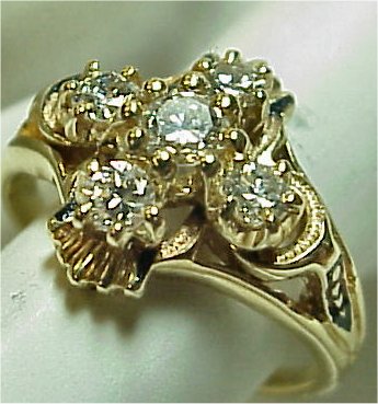 FIVE STONE DIAMOND CROSS RING: Five round brilliant cut diamonds prong set with black enamel accent edging (please note missing enamel). Center stone approx. 20pts with four outside stones approx. 10pts each. Set in 14k yellow gold, approx. 4.5grams, size 7. Est. $400/600**