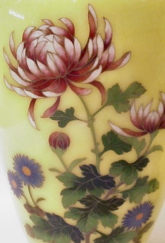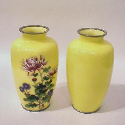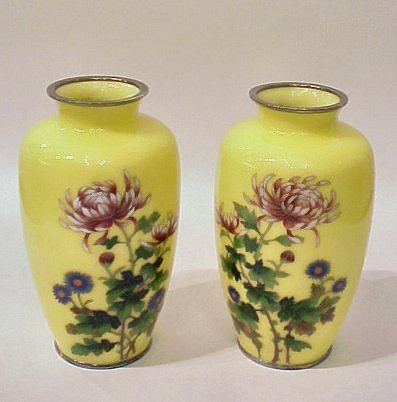 PAIR OF SILVER WIRE CLOISONNE VASES: Rare yellow ground with chrysanthemum decoration. 7''h. Est. $350/450**