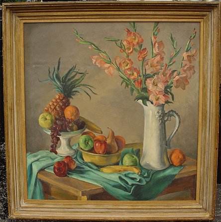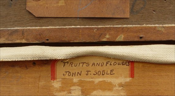 SOBLE, John, (American, 1893-): ''Fruits and Flowers'', O/C, 32'' x 31'', signed lower right, label affixed verso with artist name and title, encased in original period worn and taped gilded frame, overall with frame 38'' x 37 1/2''. Condition - Overall good condition, could use mild cleaning, minor craquelure throughout.