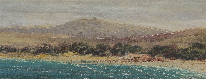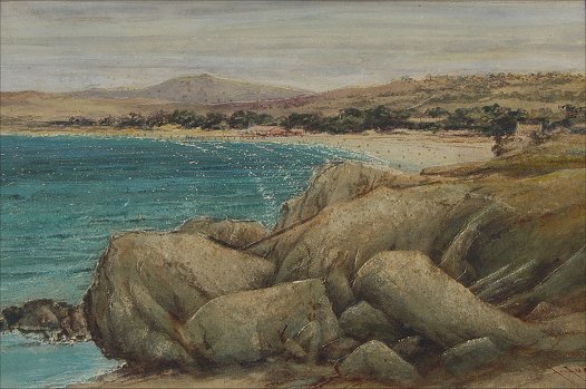 IVEY, John Joseph, (American, 1842-1910): ''Monterey'', W/C, 10 1/4'' x 15'', signed lower right, titled in pencil verso, depicts the Monterey coast with pier, encased in contemporary bleached frame, overall 17 1/2'' x 20 1/2''. Condition - Scattered foxing throughout near rocks, beach and far mountain, as well as faint spots in the sky, appears to be scratched outline in waves as well as rocks, possible insect damage?.