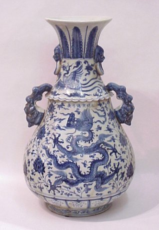 LARGE BLUE AND WHITE SIX CHARACTER VASE: Oriental dragon and floral designs are applied all over the vase in a blue glaze. The handles are near a scallop edge at the neck, and decorative rings through an animal's mouth are just below the rim. Actual age unknown, 22''h. Est. $250/350**