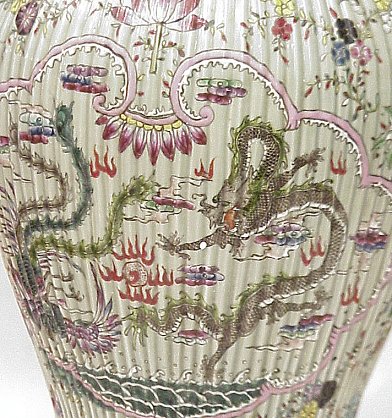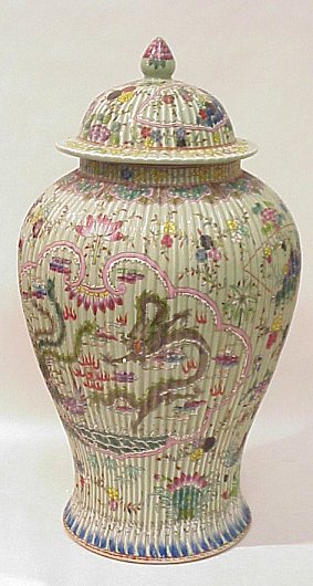 LARGE RIBBED PORCELAIN TEMPLE JAR: This lidded temple jar, sage green in color, depicts dragons and phoenix birds among an all over floral motif and ocean waves lapping around the base. Actual age unknown, 22 1/2''h. Est. $250/350**