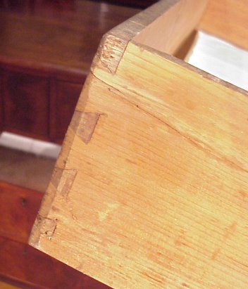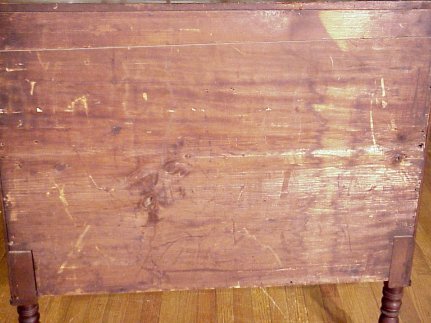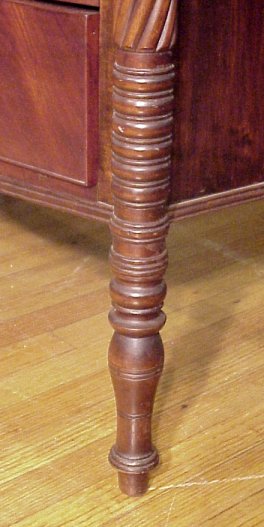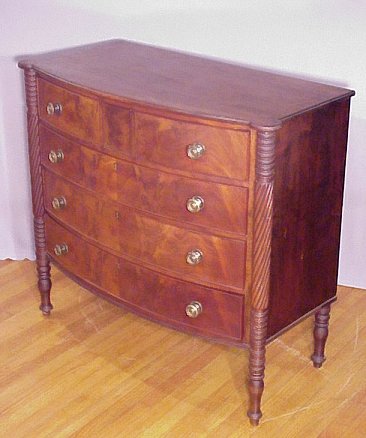 MAHOGANY SHERATON BOWFRONT CHEST: Cookie corner top over 4 drawer chest with spiral and turned stiles. Secret drawer between top drawers. Ca. Early 20th C.