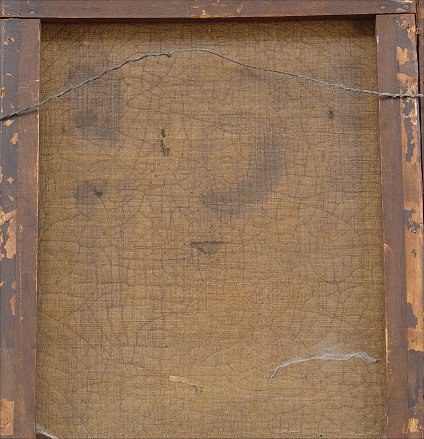 19TH C GENRE SCENE WITH FIGURES: Depicts young boy on white horse being bid farewell by his loved ones, O/C, 18'' x 15'', encased in European stretcher, superior gilded molding with faux tree branch design to border, some wear and gesso missing in upper left corner, overall 24 1/2'' x 21 3/4''. Condition - Craquelure throughout, with deterioration of canvas and missing paint in center and puncture in upper left quadrant, several scattered pinholes throughout, will need relining and in-painting.