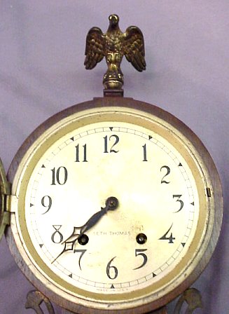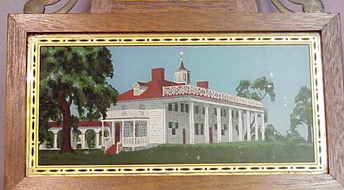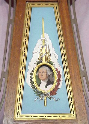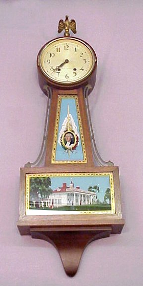 SETH THOMAS MAHOGANY BANJO CLOCK: Reverse glass image of George Washington and Mt. Vernon. With key and pendulum. 28''l.