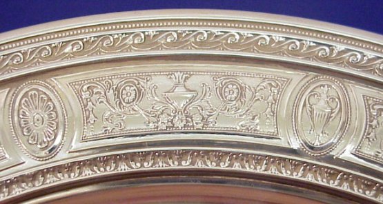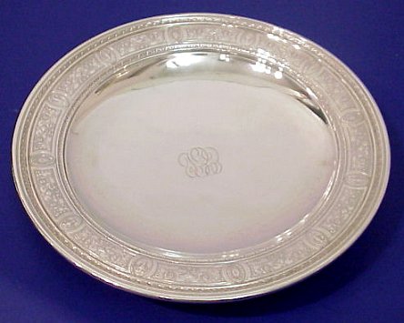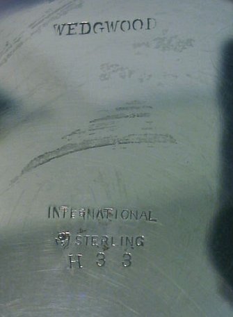 INTERNATIONAL STERLING WEDGWOOD BOWL: Embossed border on low pedestal bowl. Wedgwood pattern. 10'' dia. Approx. 11.65 oz. Slight dent.
