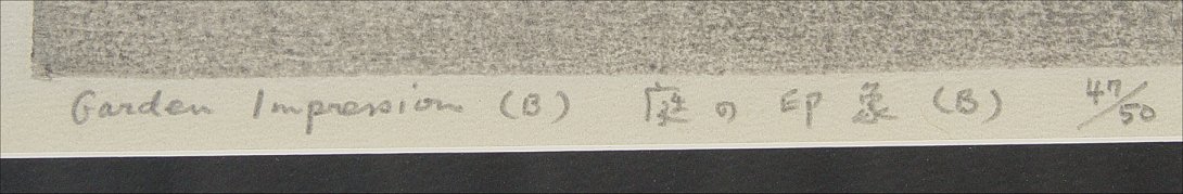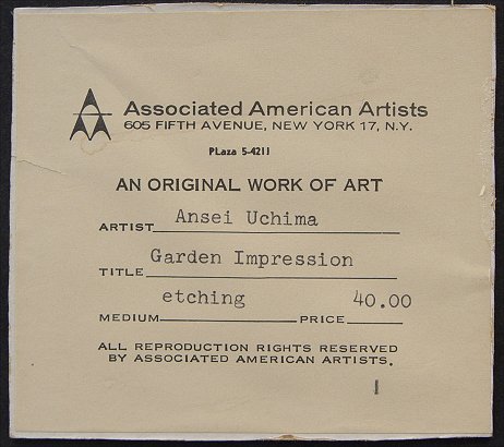 UCHIMA, Ansei, (Japanese/American, 1922-): ''Garden Impression'', Wood Cut, 14'' x 20 1/2'' sight size, pencil signed lower right, dated 1962, titled lower left, #47/50, Association of American Artist's label verso, encased in vintage frame, overall 20 1/2'' x 27''.