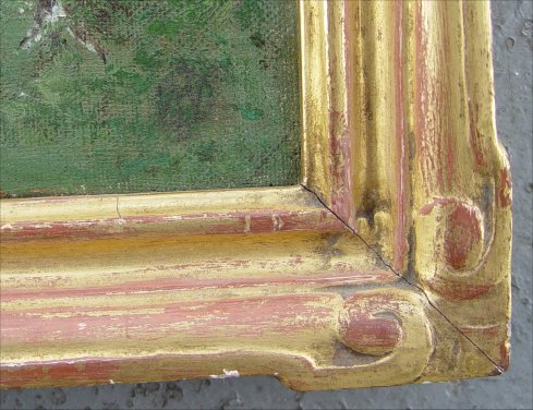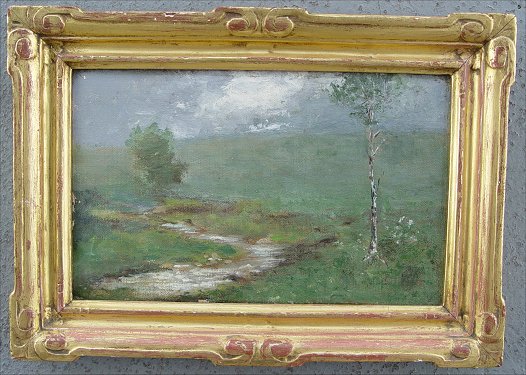 BARBIZON LANDSCAPE, UNSTRETCHED O/C: ''A Misty Day'', 5 1/2'' x 9'', illegibly monogrammed lower right, titled verso in pencil, encased in period carved and gilded impressionist molding, circa 1900.
