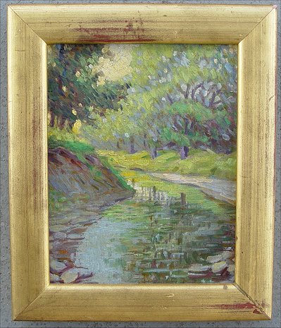 LATE 19TH EARLY 20TH C IMPRESSIONIST LANDSCAPE: O/CB, 10'' x 8'', unsigned, encased in gilded molding with worn edges, overall 12 1/2'' x 10 1/2''. Condition - No visible signature, needs cleaning.