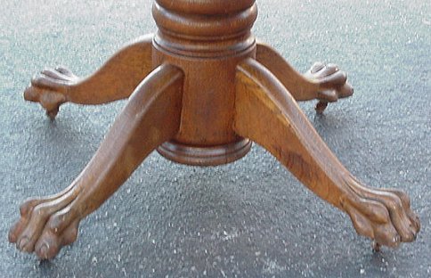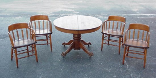 TURN OF THE CENTURY GOLDEN OAK TABLE AND 4 TAVERN CHAIRS: Single pedestal table with 4 claw feet. The table is 39'' dia. plus 2 leaves of 12'' each. 4 Windsor type tavern chairs of the same period.