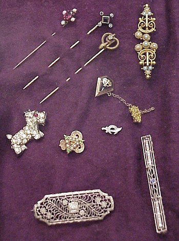 ESTATE VICTORIAN JEWELRY: To include, Three stick pins - small onyx square cornered by tiny diamonds, garnet? cornered by tiny opals and full bodied snake with clear stone. Bar pins - yellow gold swirling bead work set with turquoise and seed pearls, please note missing one seed pearl section, 1 5/8''l. and a 14k gold open work pin centered by small square cut blue stone. Adorable costume Scottie pin, unmarked, missing one clear stone from body. Four fraternal order pins. And last but certainly not least is a lovely filigree brooch of 14k white gold centered by a tiny diamond, approx. 1 1/2''l. Sold as a lot.
