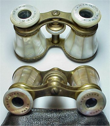 FRENCH MOTHER OF PEARL OPERA GLASSES: Two pair, one labeled Chevalier Paris, MOP on brass, 3 1/4'' x 2 1/4'' adjusting to 2 7/8'', with case. The other labeled Lamier Paris, MOP on brass with scroll trim work, 4 1/4'' x 2 1/2'', adjuster in need of tightening?. Two pair sold as a lot.
