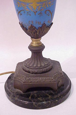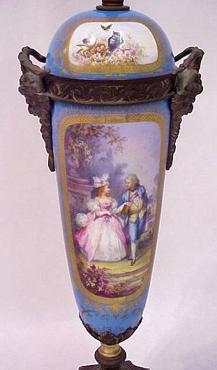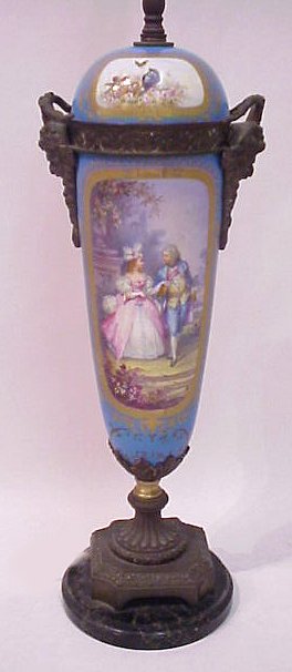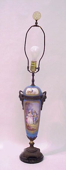 ARTIST SIGNED SERVES FRENCH PORCELAIN LAMP: Courting scene, verso with floral decoration. Metal mounts include masquerons. Artist signed Poite?in. 31''H. overall. Please call for condition.