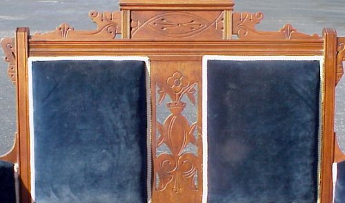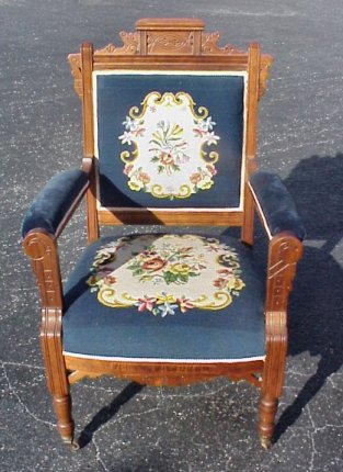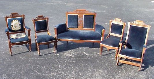 FIVE PIECE EASTLAKE VICTORIAN PARLOR SUITE: Matched set to include settee, platform rocker, arm chair, and 2 side chairs. Upholstered in dark blue velvet. The arm chair is in needlepoint. Fine condition ready for home or shop.