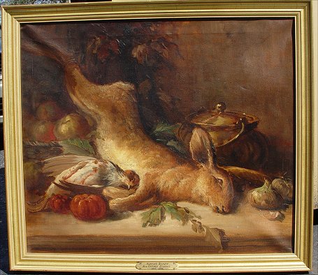 O/C OLD MASTER STILL LIFE AFTER BOCHOVE: 25'' x 29'', signature partially legible in right margin Bochove, (mis-attributed) label affixed to frame ''Hunter's Bounty'' with attribution to Gerard Steenks, later gilt frame with minor wear. Condition - Minor craquelure, small scrape in right corner, small puncture in lower right corner, needs cleaning.