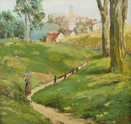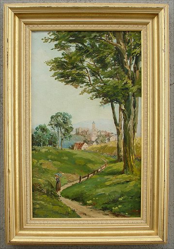 IMPRESSIONIST LANDSCAPE, O/C: Depicting a lone female figure traveling down a winding path leading from a village, 18'' x 10 3/4'', signed lower right L Claude, encased in a quality gilded molding with some wear, overall 22 3/4'' x 15 1/4''. Condition - Patch visible verso, as well as two small tears, in-paint visible with black light and upon close inspection.