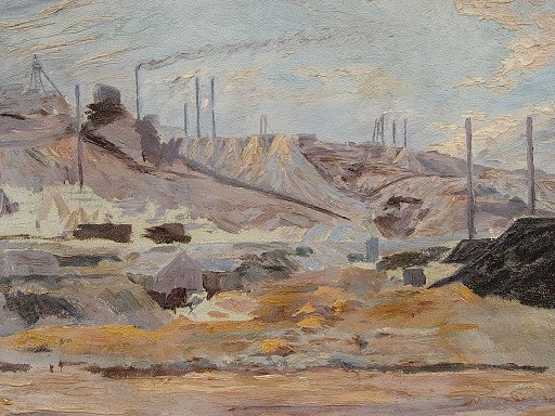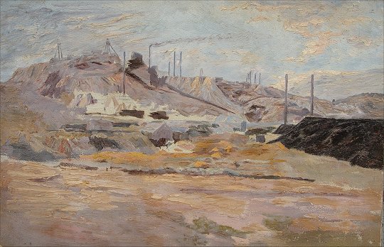 IMPRESSIONIST O/PRESSED BOARD, CA 1930 OF EXCAVATION SITE/MINING CAMP: 12'' x 18'', no visible signature. Condition - Needs cleaning.