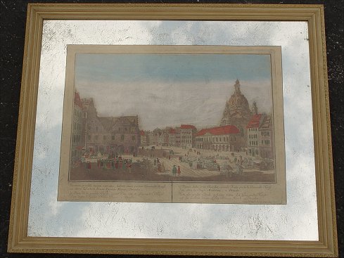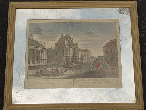 PROBST, Georg Balthasar, (German, 1673-1748): Pair of hand colored copper engravings, ''La Chapelle au Versailles'' and a similar scene ''La Piatza dela Grande Gurdia Dresden'', both approx. 13'' x 17 1/2'' sight size, encased in 20th C moldings, overall 20 1/2'' x 24 1/2''.