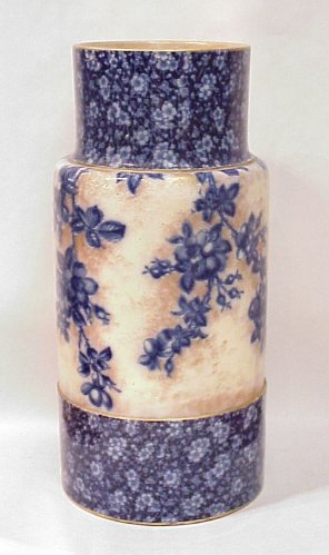 DOULTON BURSLEM FLOW BLUE UMBRELLA STAND: Circa late 19th very early 20th C. Impressed ''Doulton'' and the Doulton Burslem stamp underglaze. 24''h, 9'' dia. No cracks or chips.